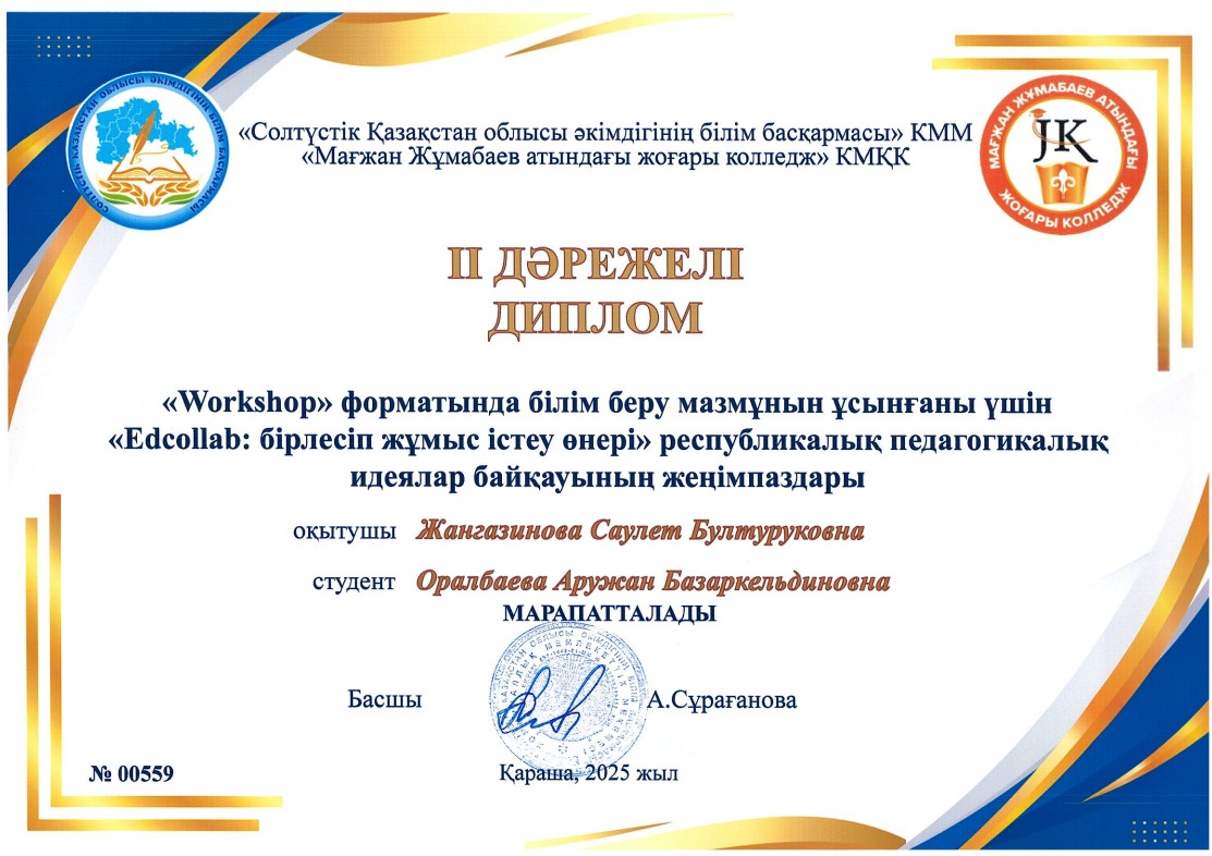«Ынтымақтастық педагогикасы» бағыты бойынша арнайы пәндер оқытушысы Жангазинова С.Б. мен МДТО-41 тобының студенті Оралбаева Аружан әзірлеген практикалық бағыттағы воркшоп II дәрежелі дипломмен марапатталды.