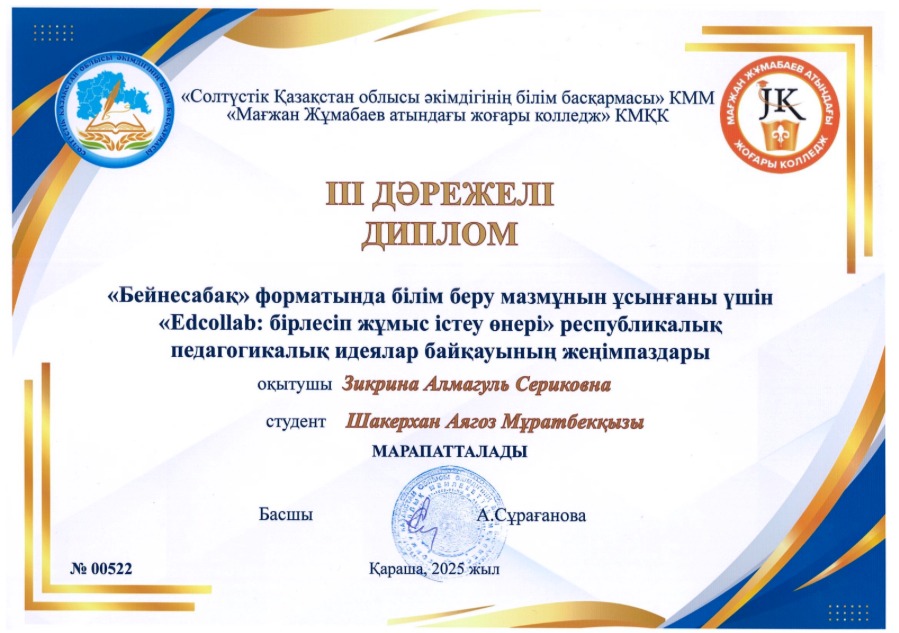 «Цифрлық коллаборация» бағыты бойынша арнайы пәндер оқытушысы Зикрина А.С. және БББ-32б тобының студенті Шакерхан Аягөз заманауи технологияларды қолдана отырып әзірлеген цифрлық білім беру ресурстары үшін III дәрежелі дипломға ие болды.